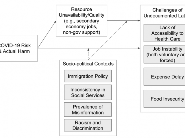 Certain U.S. population groups have suffered higher rates of infection and mortality than whites during the COVID-19 pandemic, including Latinx. Public health officials blamed disparities on overcrowded housing and work in essential industries prior to the vaccine’s availability. This study (n=34) focuses on the intersectionality of social locations for undocumented Latinx immigrants living in a relatively affluent suburb and working in the construction and service sectors. Their narratives revealed how the pandemic created financial precarity through prolonged periods of unemployment and food insecurity. Workers described worry over unpaid bills, and potentially catastrophic episodes in which they treated severe COVID-19 with home remedies. We argue that long spells of unemployment, food insecurity and lack of access to healthcare emerged because of social-political contexts including low-wage labor and lack of a safety net.