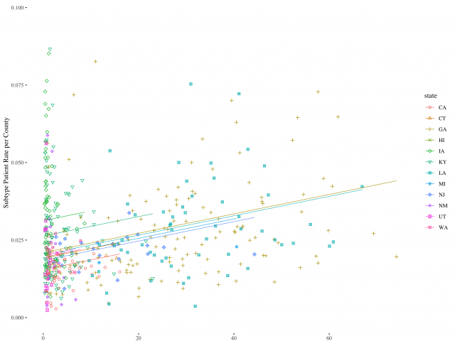 The baseline breast cancer rates between black and white women were similar in the population (0.171% for black and 0.168% for white). Consistent to previous studies, we demonstrate a significant positive correlation (p < 0.001) in TNBC in black females in both years. Surprisingly, when accounted for the random effects on states, 38.2% (2015) and 34.3% (2016) increase in incidence of TNBC in black females were seen, suggestive of state-specific disparity affecting race-specific health. In 2015, other subtypes of breast cancer in both black and white females did not result in significant relationship. Interestingly, in 2016, there was a significant relationship seen between the TNBC rate in white females and the white female population rate only after adjusting for the state effect (p = 0.026). This indicates the impact of non-biological factors such as state-wide health policies. Additionally, HR-HER2+ black females had a significant relationship against respective population rate only after adjusting for the state effect as well (p = 0.0394). For luminal A white females, a 15% decrease in incidence was seen after adjusting for state effect (p = 0.0424).