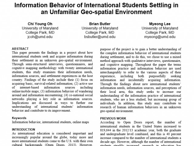Oh, C., Butler, B., & Lee, M. (2014). Information Behavior of International Students Settling in an Unfamiliar Geospatial Environment. In Proceedings of the Association for Information Science and Technology (ASIST). 51(1). pp. 1-11. https://doi.org/10.1002/meet.2014.14505101068