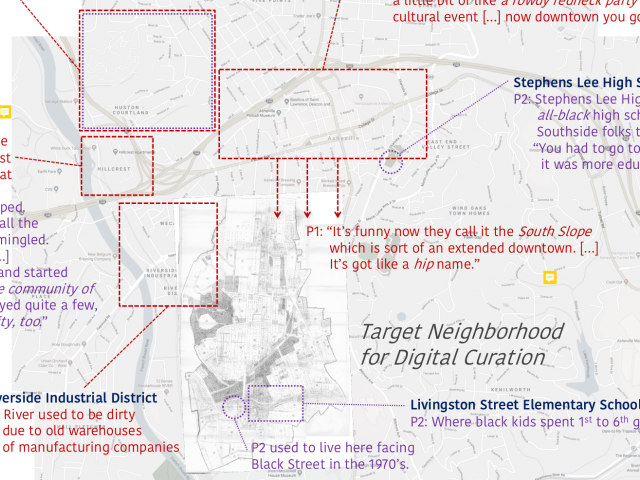 Urban renewal was a project of the American government that aimed to reconstruct poor urban neighborhoods. Because community-level data that shows the underlying mechanisms of urban renewal has not been curated in a systematic way, due to the complexity and volume of the relevant archival collections, we aim to digitally curate property acquisition documents from the urban renewal projects that affected the Southside neighborhood of the city of Asheville, North Carolina, in the form of a map-based, interactive web application. This paper reports early findings from interviews. We analyze how Asheville citizens of different generations remember their neighborhood before and after the multiple waves of gentrifications that they have experienced, based on personal interviews. The result of this comparative analysis provides design implications for the archival system we are developing by revealing the inter-generational value structures of potential users.