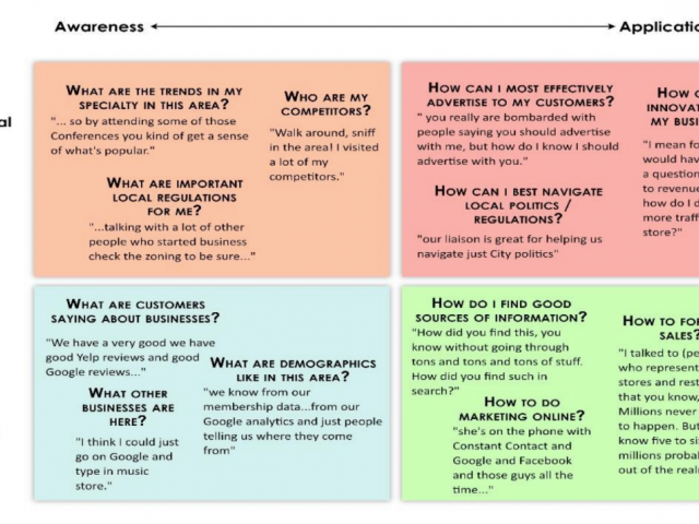 Independent business owners often prefer informal information sources to formal ones such as library collections. Part of these preferences is rational because contextual and application-oriented information is usually available from informal sources, which are theoretically the best matches for this kind of information. This suggests that, in addition to outreach strategies, efforts to integrate informal sources of business-relevant information can improve public libraries' ability to support independent business owners' information needs. Through interviews with business information providers and users, we explore the multi-dimensional space of information needs in independent businesses.